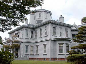 大理石や蒔絵を惜しげもなく用いた調度品、部屋によって異なる天井飾りなど 明治時代の皇族の華やかさを伝えています。この建物は木造2階建てで国の重要文化財にも指定されています。